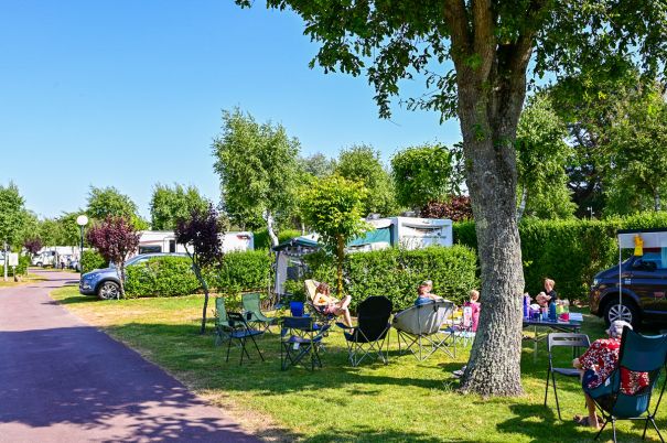 Een grote plaats van ongeveer 100 m² voor 2 tot 6 personen, omringd door heggen die uw privacy beschermen: tent, caravan of camper vinden hier moeiteloos hun plek.Geen heen‑en‑weer meer naar de gemeenschappelijke sanitairgebouwen: u beschikt over uw eigen sanitair met wc, douche, wasbak en kleine koelkast om uw drankjes koel te houden. Aansluiting op water, afvoer en elektriciteit inbegrepen… alles is aanwezig voor een makkelijk, soepel en rustgevend verblijf.