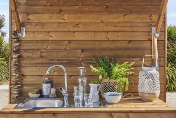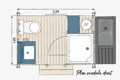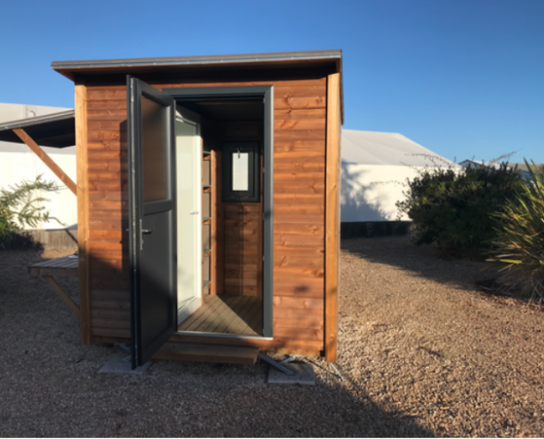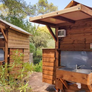 De “Sérénité” plaats (100 m²) biedt uw eigen privé‑sanitair: wc, douche, wasbak en kleine koelkast. Het plezier van kamperen, maar dan met extra privacy.