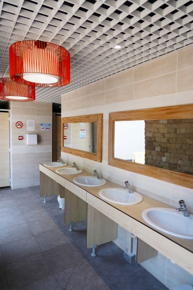 - Toiletten, douches, stortplaats voor chemische toiletten, wasbakken