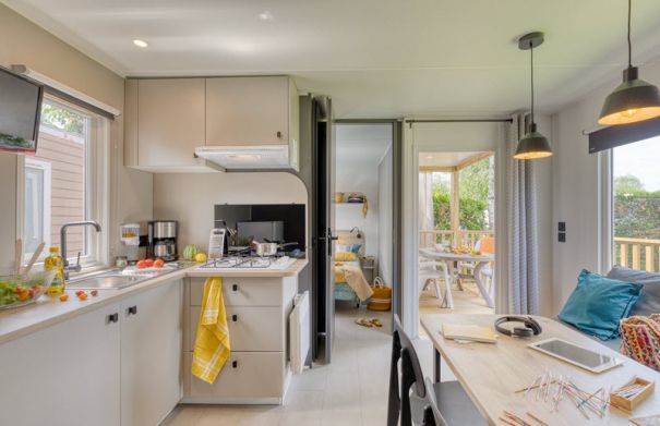 Of het nu open of semi-overdekt is, afhankelijk van het model van de stacaravan, het is een extra ruimte die uitnodigt tot gedeelde momenten: barbecueën met de familie, bordspelletjes, avonden onder de sterren, een borrel of koffie met vrienden...