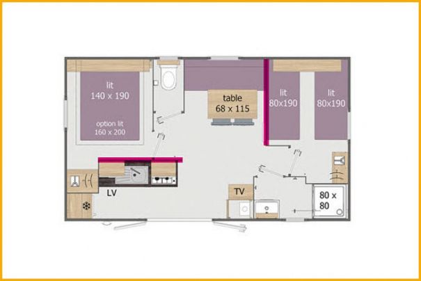 Functionele en comfortabele stacaravans voor een stel of gezinnen met jonge kinderen. Geschikt voor 4 personen, een oppervlakte van 24 m² en 2 slaapkamers gescheiden door de woonruimte. Ze zijn beschikbaar voor verhuur per week, twee weken of in het weekend (2 nachten).